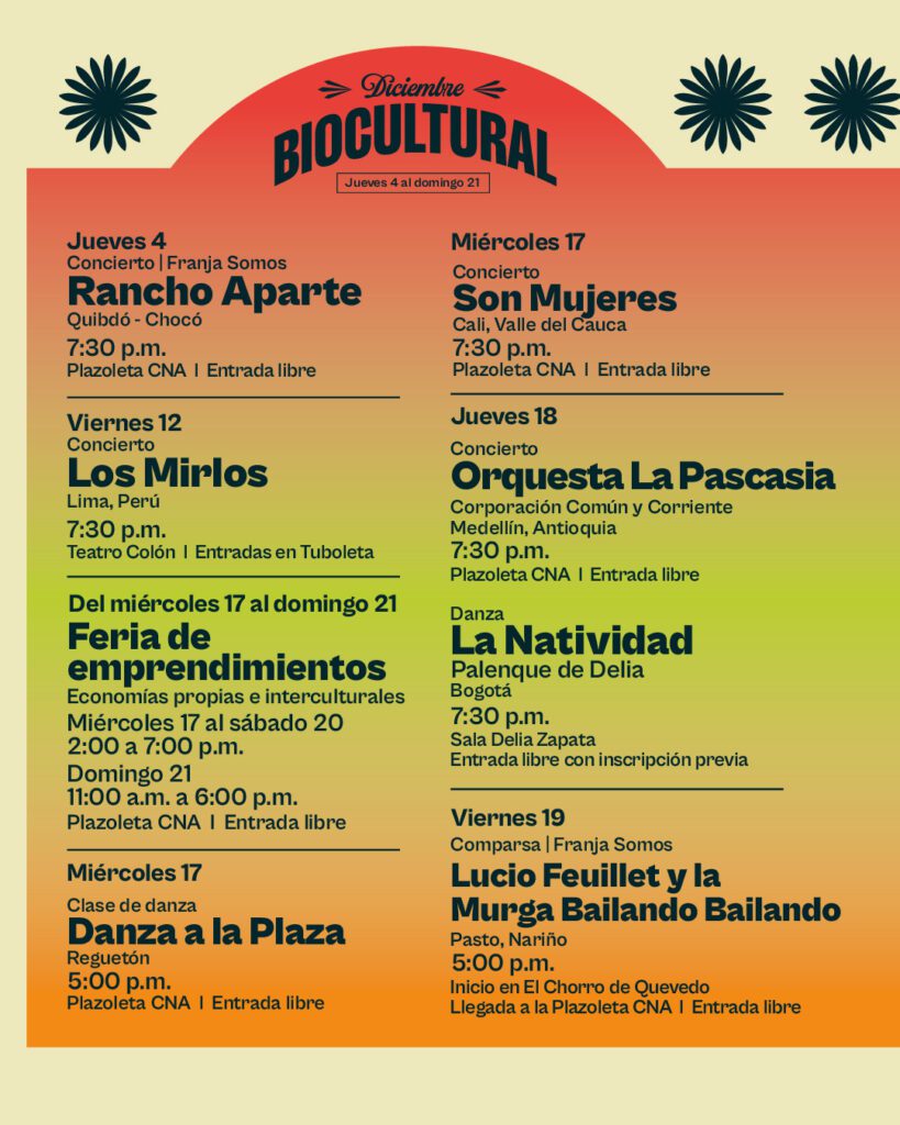 Desde cumbia amazónica hasta salsa, murga, picoteo y homenajes de big band; desde el sonido andino hasta las pulsaciones afrocaribeñas, Diciembre Biocultural es una invitación a resonar con la música como territorio de memoria, creación y comunidad en el corazón de Bogotá.