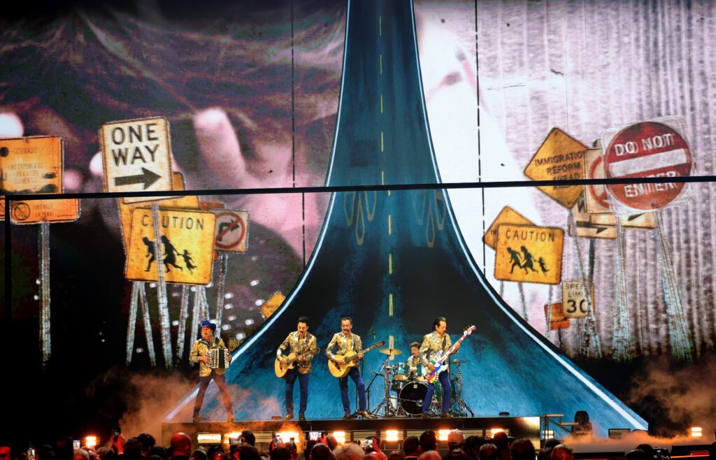 La apertura fue un guiño poderoso a nuestras raíces: Carlos Santana lideró un medley con Maluma, Christian Nodal, Édgar Barrera y Grupo Frontera, combinando “Oye cómo va” con “Corazón espinado” y “Me retiro”. El sonido fue clásico, pero la puesta en escena fue puro presente. Acto seguido, Aitana trajo el pop contemporáneo con una estética minimalista y control absoluto de escena.